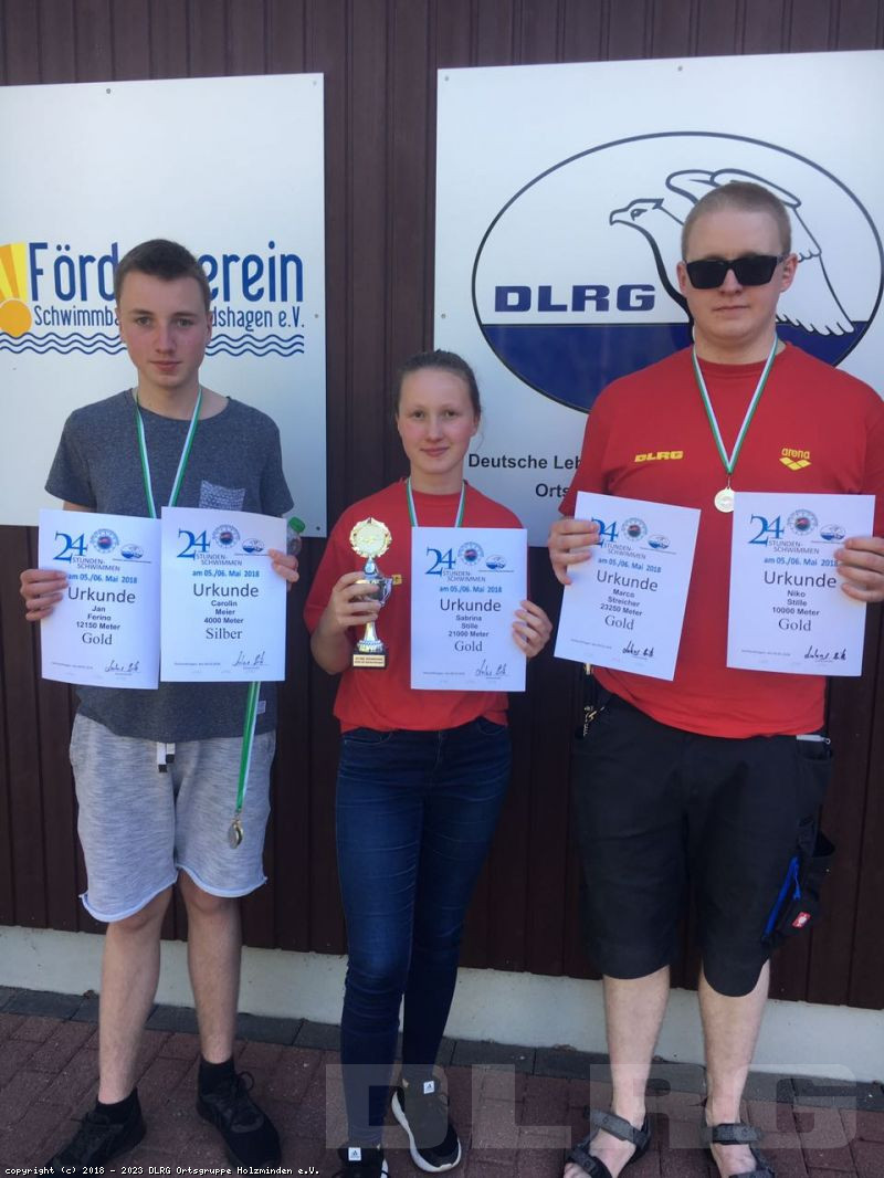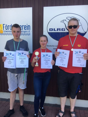 Am 5. Mai ging es für 5 Mitglieder zum 24-Stunden-Schwimmen nach Reinhardshagen. Und die Ergebnisse können sich sehen lassen. Carolin Meier (4.000 m) und Niko Stille (10.000 m) verabschiedeten sich bereits abends gegen 22 Uhr mit sehr guten Ergebnissen. Übertroffen wurden sie natürlich um Weiten von den Verbliebenen, die hauptsächlich die Nacht zum Schwimmen auf den freien Bahnen nutzten. Jan Ferino erreichte 12.000, Marco Streicher 23.000 und Sabrina Stille 21.000 Meter. Sie konnte damit den ersten Platz in der Altersklasse "Weiblich 14-18" erzielen. Dafür erhielt sie einen Wanderpokal, den es selbstverständlich im nächsten Jahr zu verteidigen gilt.